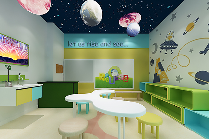 少兒英語培訓(xùn)學校一般會根據(jù)年齡的不同劃分為若干個班級,設(shè)計師要根據(jù)空間面積合理劃分。設(shè)計師在設(shè)計的時候要盡可能的將學習區(qū)域與玩耍區(qū)域劃分開,保證孩子們有足夠的寬敞的活動空間。對于角落空間可以制作儲物柜或者小擱架,不僅可以擴大室內(nèi)空間,而且還可以形成美觀、流暢及統(tǒng)一的視覺效果。